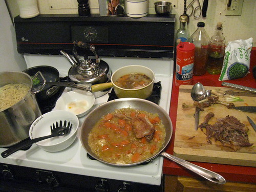 Ramen Mise en Place. Clockwise from 12 o'clock Duck Broth, Shredded meat on the cutting board, Braised Duck Leg, Boiling Noodles, and Egg Poaching set up behind it.