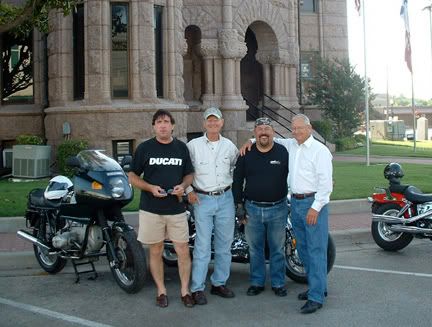 All pictured are employees of the Denton ISD. L-R: Steve Beck (1978 R100), Monte Miller (1981 R65), Joe Alvarez (Honda Rice cruiser) and Richard New (another Rice rider). Photo was snapped by Bobby "O" (R90)