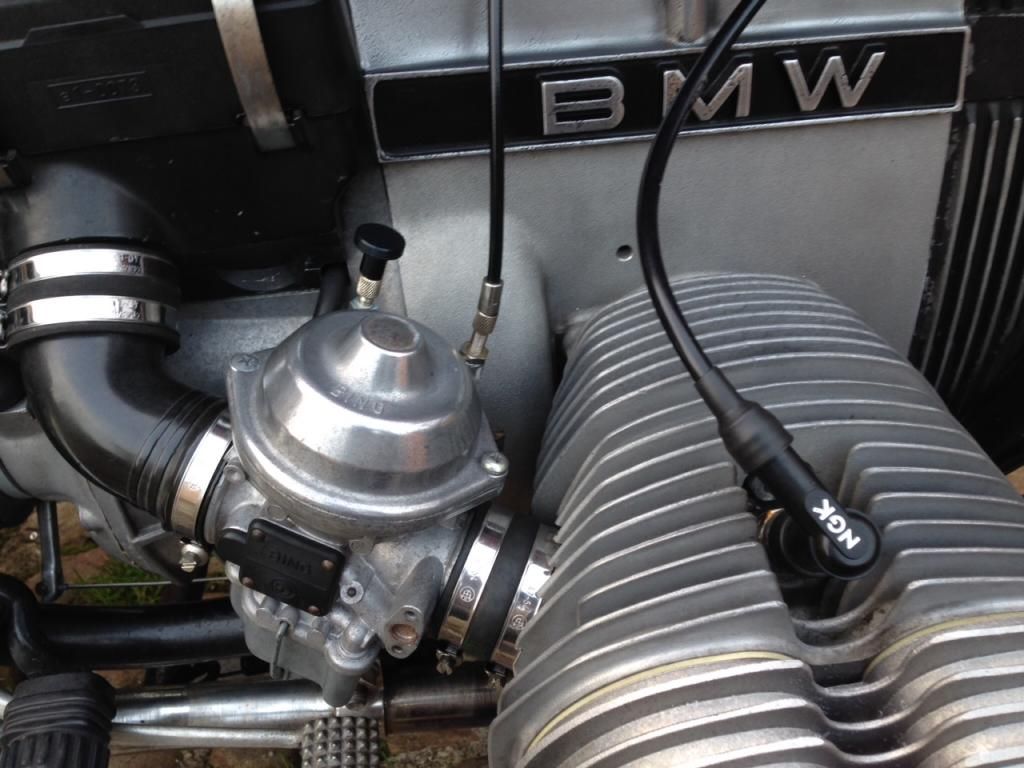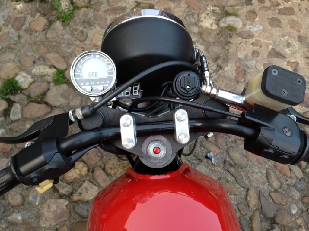 Like the carb mounted chokes as well (bought from Germany). Along with moving the starter button to the frame gusset in front of the tank (you can just see the red button in the pic), this has cleaned up the bars no end.
