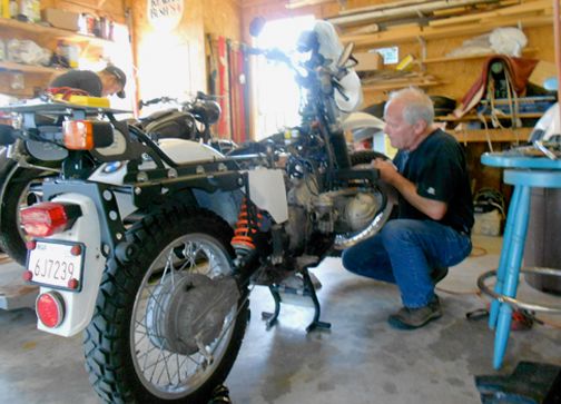 Texas Air Marshall Mike Moon assists with the install of a new ND starter replacing the much heavier Bosch unit in this well used R80PD.