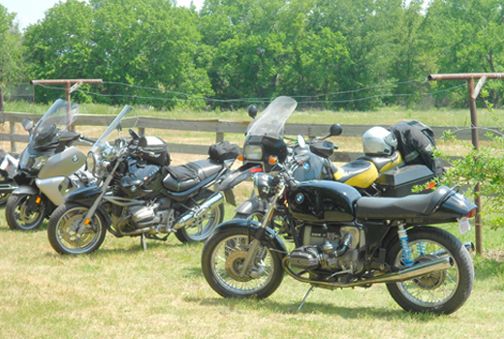 Tech day was definitely out in the country. My ride up and back was through fields of wild flowers and bright green trees. Spring done Sprung. My R100S got quite a bit of photo attention. Gosh. Note the new BMW scooter peeking out the left end of the bike line.