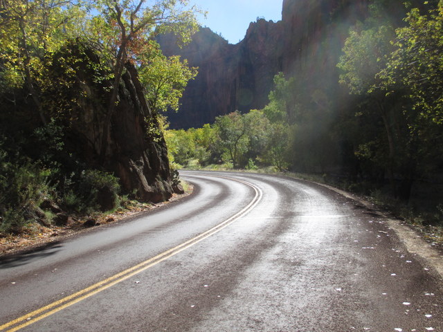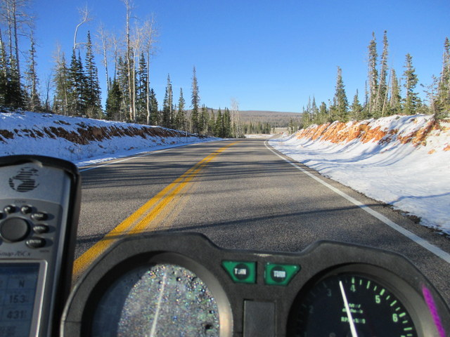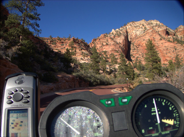 I've already spent a bunch of time in Vegas, and while I like it there, I don't feel like going this time. Looks like Utah is right there! I'm going to Zion National Park! It's suposta be great! As I rode through Vegas and continued up north, the temperature started to drop. I pulled my tablet out and checked the weather. There is a low of 34f. No way I'm camping. I'll die. I can imagine the poor person who would find my preserved dead frozen body. I don't want to do that to anyone, so I'll just get a cheap room near the National Park and check it out in the morning. That night the temperature got down to 28F according to the LED sign at the bank across the street from my room at the hotel. I need to gear up if it's going to be this cold, so I found a store and bought some flannel to wear under my leathers, and some socks.