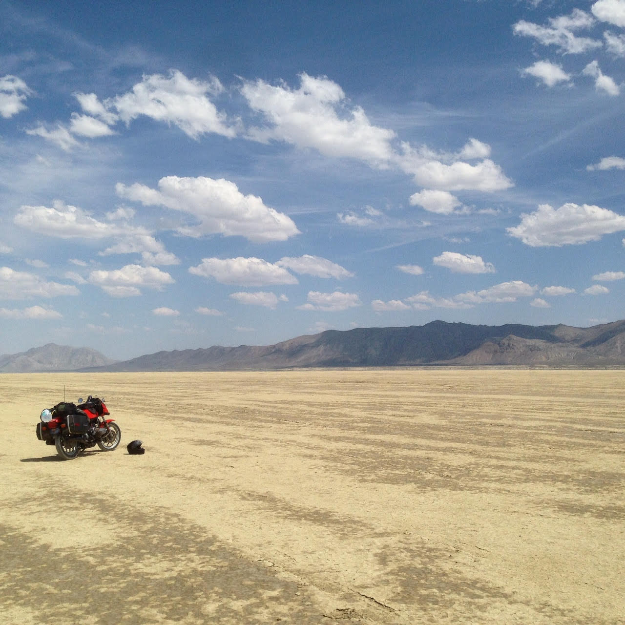I rode out to the Black Rock Desert from my camping spot just outside of Reno.  Unfortunately, this was not very hard packed and the moto's wheels felt like they were sliding all over the place.  I wanted to camp near one of the hot springs in the area, but I felt it was too dangerous to ride out there alone on this bike with the playa condition the way it was.  You really don't want to break a leg out there, or have a mechanical because you're probably going to die if nobody finds you.  As you can tell from the photo, the silty playa dust was a bit damp which makes things turn into a goopy mess.  I suppose they got some rain from the same storm I ran into the day before.
