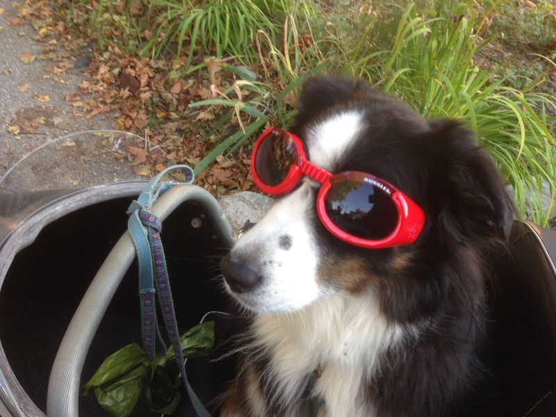 I took Trevor to the farmer's market this morning. Then on a couple of other errands. He seemed to be having a great time. He didn't try to jump out, just wanted to keep an eye on his moma as she rode her scoot along with us. We need to get him some Doggles, I kept the speed down today but maybe he's ready to go a bit faster. Also a better photographer.