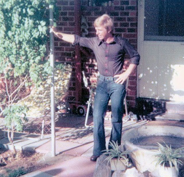 About 1974, Body shirt, flared tight jeans, platform shoes!!!  And the girl who took this photo said I looked like Robert Redford!!